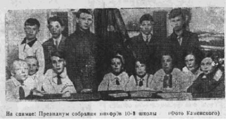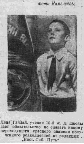 «11 мая 10-я железнодорожная школа отмечала славный путь своей стенной газеты «Строим культуру», завоевавшей первенство среди школьных газет города Иркутска» – так начиналась статья в «Восточно-Сибирском пути» за 1936 год. Под статьёй – снимок мальчишки у знамени и подпись: «Лёня Гайдай, ученик 10-й ж.д. школы, даёт обязательство не сдавать никому переходящего красного знамени, полученного редколлегией от редакции «Востсибпуть». На еще одной фотографии – президиум собрания юнкоров школы, на этом фото маленький Лёня Гайдай в самом центре. На снимках ему около 12-13 лет. Его брату Шуре – 16-17 лет. Именно он в этот, 1936 год был редактором школьной стенной газеты «Строим культуру». И ему предоставили честь выступить во «взрослой» газете. Юного Лёню запечатлели только на фотографиях. Конечно, заметка 1936 года построена по канонам официальной печати того времени. Потому юный Шура Гайдай говорит каким-то странным языком, некоего советского функционера, а не простым мальчишеским, который больше ему был свойственен и который ещё проявится в его собственных статьях.