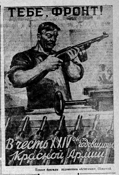 Иркутские газеты были «завязаны» на события в Москве и на фронте очень сильно. Поэты сочиняли «стихи-агитки», например, у Молчанова-Сибирского был аналог известной фронтовой песни «Граната», но наш поэт описывал любовь бойца к сапёрной лопате: «Малая сапёрная, ловкая, проворная. Малая лопата – помощница в бою. Про тебя, лопата, песню пропою». «Страшный призрак ближе-ближе мчится из тумана, это Дед Мороз на лыжах в шапке партизана», – практически каждый номер «укороченной» военной «Восточки» сопровождали карикатуры и стихи. Эти – снова Анатолия Ольхона.