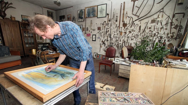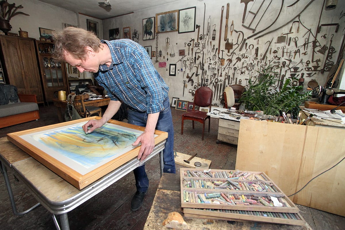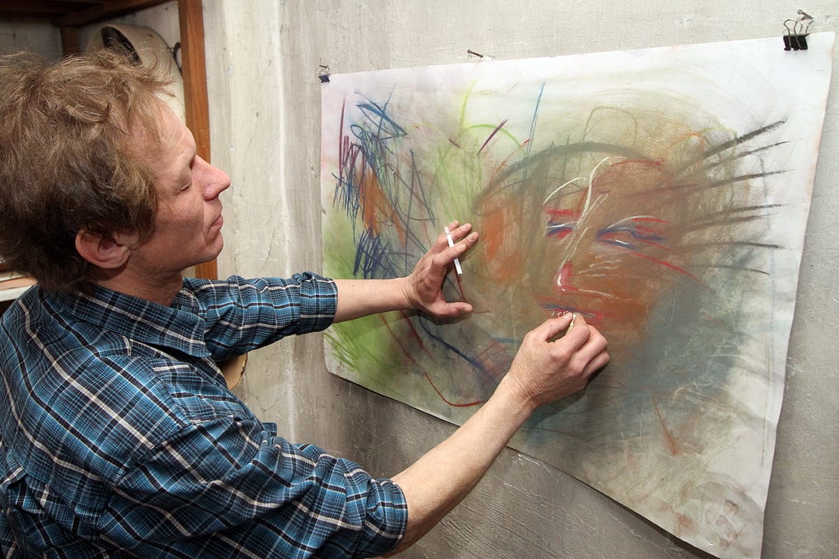 – Тамара Григорьевна предложила нескольким художникам, не состоящим в Союзе художников, принять участие в выставке. Фамилии я не могу сказать, потому что несколько человек уже «отвалились», и я сейчас занят тем, что пытаюсь не «отвалиться» сам. Дело в том, что я хотел выставить принты своих старых работ, и были люди, которые согласны были сделать эти принты, но, пока я собирался, эти люди уехали на несколько месяцев за границу. И получается, что моя выставка будет представлена целиком из новых работ. Пастелей около десяти штук, они довольно большие. Я никогда не рисовал пастелью и всегда избегал такого размера. Тут есть некая экспрессия, воплощение импульсивной энергии – идея не новая, но эти работы совершенно, вообще беспредметны. Для меня характерны графика, академический рисунок, я очень строго отношусь к анатомии, особенно после работы в мультипликации. А это совершенно беспредметные рисунки. Но мне некоторые вещи нравятся – вот эта энергия, которую ты вкладываешь за короткий промежуток времени: отдельные работы были сделаны не просто за один вечер, но буквально за три минуты.
