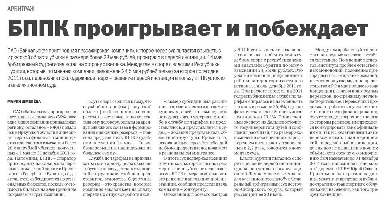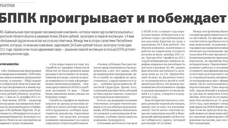 Спор между ОАО «Байкальская пригородная пассажирская компания» и одним из двух его акционеров – правительством Иркутской области – продолжается. Напомним, перевозчик пытается через суд добиться возмещения своих убытков из бюджета региона и одновременно продолжает их генерировать, поскольку цена билетов на электрички для населения не покрывает расходов компании. На прошлой неделе временно исполняющий обязанности губернатора Сергей Ерощенко пообещал БППК возместить недополученные доходы, но при одном условии. Пока перевозчику выполнить его не удаётся.