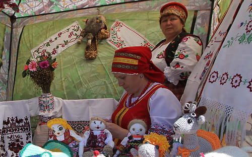 – У них очень хорошо, качественно сделанные вещи. Но не эти – это ярмарочный вариант, не для художественной выставки. Видимо, здесь только то, что смогли привезти. У этих мастеров обычно очень хорошие костюмные куклы – из глины, соломы, тряпичные. У нас несколько лет назад была мастер из Петербурга, Марина Мишина, она нас научила делать тряпичные куклы правильно, и у заларинских мастеров это хорошо получается.