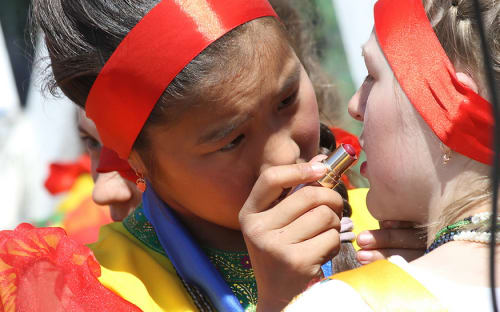 – Ольхонский район – самодостаточный, с бурятским колоритом, – начала обзор Наталья Игоревна, остановившись у стенда Ольхонского муниципального образования. – Много сувенирной продукции, потому что много туристов. Например, вот эти блестящие куколки – не очень, а вот те, что сделаны из глины, внешне грубо – это вообще высший пилотаж, – она показала на группу фигурок, изготовленных к Ёрдынским играм. – Здесь минимальное влияние современности, очень деликатно сделано.