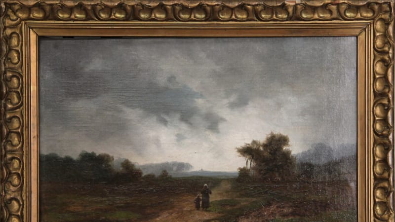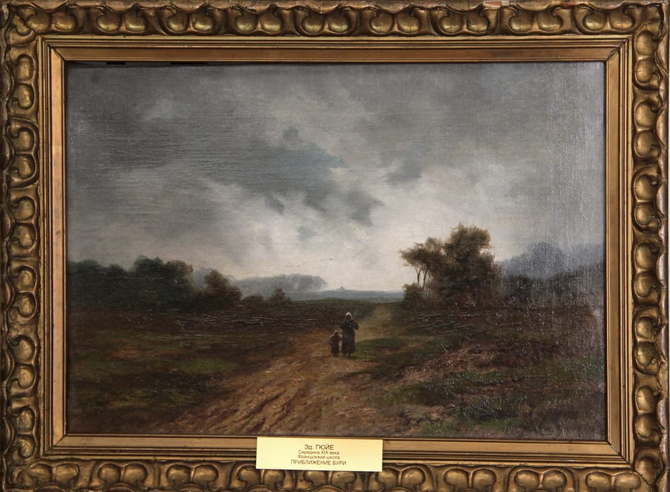 С этой интересной историей мы можем ознакомиться на конкретном примере. В одном из залов Иркутского художественного музея висит небольшая и, по современным меркам, совсем неприметная работа французского художника Эда Гюйе «Приближение бури». Неискушённый зритель, скорее всего, просто пройдёт мимо пасмурного пейзажа. Смутные фигуры женщины и ребёнка на просёлочной дороге едва ли притянут взгляд. На самом деле перед нами одна из работ художника знаменитой барбизонской школы XIX века.