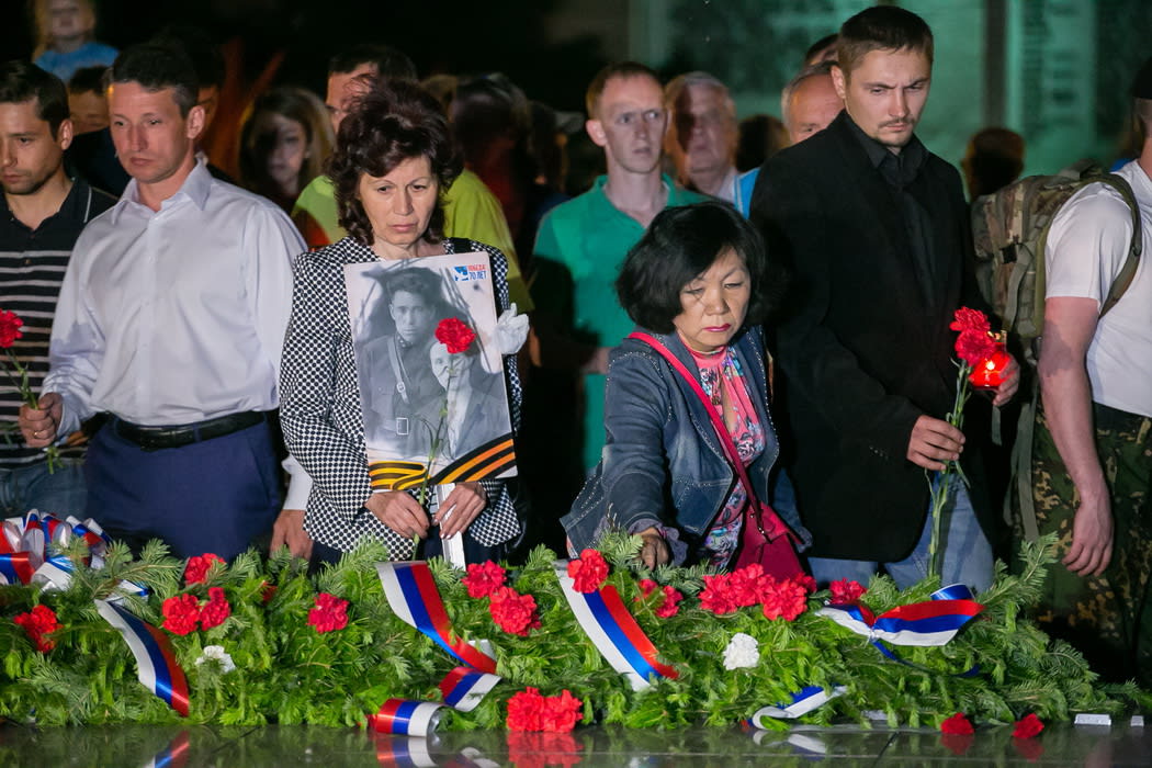 Официальное начало акции в 21.30. Но люди приходят задолго до указанного времени. Около Вечного огня собираются сотни иркутян: и молодёжь, и старики, и дети. Многие приносят с собой портреты близких, участвовавших в Великой Отечественной войне. Те самые портреты, которые 9 Мая составили «Бессмертный полк».