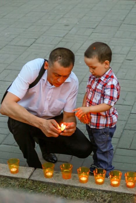 Этим вечером радуются только маленькие дети. Просто потому, что пока не понимают, что это за грустный день. Ведут себя раскованно и беззаботно. Кто-то играет в догоняшки, кто-то пытается посчитать свечи, расставленные по периметру Вечного огня: «Десять, одиннадцать, очень много…», – но трое совершенно выбиваются из группы ровесников. Мальчик и две девочки. Одна из этой тройки, 11-летняя Вика Хоботова, сама подходит ко мне и берёт за руку: «Пойдёмте, я покажу вам своего прадедушку». Прадедушка, сидящий на коне, смотрит на нас со снимка. С обеих сторон фотографию держат крепкие сыновьи руки – руки Викиного дедушки. Он-то, Анвар Хаиров, и привёл сюда внучат. Глаза его спрятаны под тёмными очками. Некоторое время молчим. А потом мужчина начинает медленно и тихо: «Я помню, был на теле бати шрам от вражеского минного осколка. И как вставал он часто по ночам и брал альбом со старой книжной полки…» Анвар Сафиулович рассказывает стихотворение собственного сочинения. Немногим позже я узнаю и историю его отца, прошедшего всю войну, и историю жизни самого Анвара, всю жизнь проработавшего в органах МВД Иркутска. «Мы всегда ходим на такие мероприятия. Нельзя не ходить, нельзя не брать детей, – говорит Анвар. – Потому что о счастливом и прекрасном они узнают сами. А о том, что невероятно страшно и вместе с тем свято, рассказать им должен я». В акции «Свеча памяти» семья принимает участие уже в третий раз. После нашего долгого разговора дедушка угощает внуков бубликами и снова очень тихо произносит: «Ешьте на здоровье». А потом еле слышно прибавляет: «Вот нам иногда приходилось есть траву».