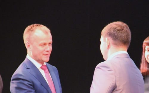 Когда выпускники проследовали в зал и расселись по местам, началась торжественная часть. Церемонию вручения медалей открыл глава региона Сергей Ерощенко. «Уважаемые выпускники, дорогие наши дети, я искренне счастлив, что у меня есть возможность присутствовать здесь, – сказал он. – Для меня лично это событие радостное. Я очень горд тем, что наша область славится такими талантливыми людьми. Я искренне поздравляю вас с завершением этого этапа вашего нелёгкого труда. Золотая медаль – важная награда, которая даёт вам серьёзную путёвку во взрослую жизнь. Я хочу поздравить ваших родителей, бабушек, дедушек, потому что ваша награда – это награда семьи. Все гордятся вами. Это счастье объединяет вместе педагогов, родителей, выпускников. Вы  – счастливое будущее Иркутской области и России. Мы гордимся вами, любим вас, будем помогать вам во взрослой жизни».