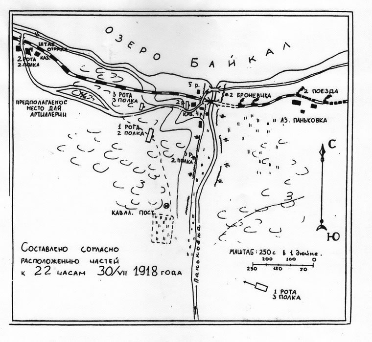 Рапорт командира 1-го эскадрона 1-го Томского кавалерийского дивизиона штабс-капитана Плотникова начальнику 1-й Сибирской дивизии Средне-Сибирского корпуса, составленный 1 августа 1918 года, содержит подробное описание прошедшего сражения: «…В 19 часов 29 июля, когда части заняли позицию на левом берегу реки Паньковки, мною было приказано вновь разобрать путь впереди мостов железной дороги, что и было выполнено 2-м и 4-м взводами. Пулемёт эскадрона занял позицию на левом фланге общего расположения наших частей рядом с пулемётом 3-го Томского полка, согласно приказанию командира того же полка. Задачей пулемётов была охрана подступов левого фланга по тракту, через деревянный мост и по железнодорожному пути, а также охрана переправы. В течение вечера было сооружено пулемётное гнездо и установлена охрана пулемёта из бойцов 4-го взвода. Ночью противник, используя отсутствие артиллерии с нашей стороны, при освещении костров исправлял разобранные нами пути на дальнем от реки расстоянии. 30 июля в 8 часов утра с разъезда Паньковка вышел бронированный поезд и стал продвигаться вперед, исправляя разобранные нами пути на повороте линии. Около 12 часов с поезда стали выходить красные и рассыпаться в цепь от линии железной дороги до берега Байкала, делая перебежки по направлению к деревянному мосту на тракте. Наши пулемёты обстреливали противника, находясь всё время под сильным артиллерийским огнём, причём шрапнели разрывались в весьма близком (1-2 сажени) от пулемётного гнезда расстоянии.