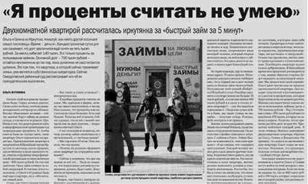 Иное дело, когда соглашения о займе «приправляются» другими сделками, призванными уменьшить риски невозврата долга. Именно так и получилось с семьёй Пятаковых. Ольга и её мать Галина были постоянными клиентами одной из точек по выдаче займов, расположенной рядом с их домом в микрорайоне Юбилейный Иркутска. Однажды, «увязнув» в займах и кредитах, мать и дочь придумали, на их взгляд, оптимальный выход из затруднительного положения. Они решили взять в долг у микрофинансовой организации несколько сотен тысяч рублей, этими деньгами рассчитаться с другими кредитами. На оставшиеся задумали сделать ремонт в квартире.