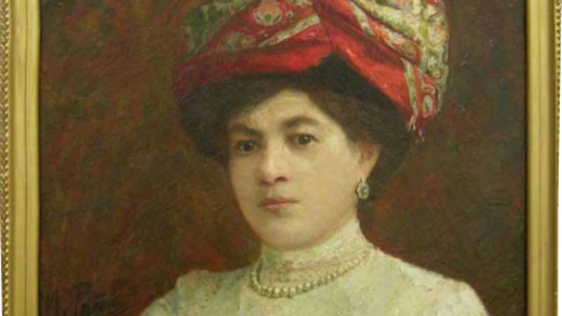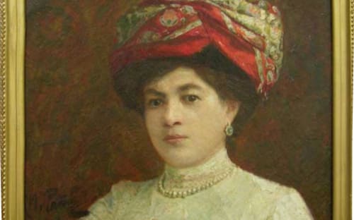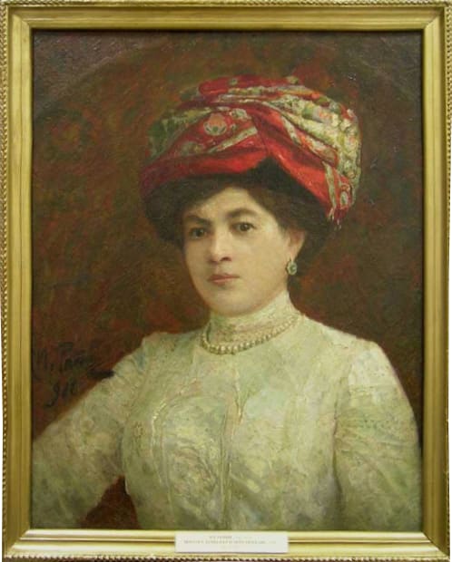 Два живописных портрета кисти Репина подарены музею Феликсом Евгеньевичем Вишневским – замечательным московским коллекционером, основателем Государственного музея изобразительных искусств им. А.С. Пушкина и музея В.А. Тропинина и московских художников его времени. Портрет «Итальянки» написан Репиным в 1870-е годы, в это время художник путешествует за границей в рамках 6-летней пенсионерской поездки и живёт не только во Франции, но и проводит несколько месяцев в Италии. В Италии Репин почти ничего не пишет, как будто набираясь сил перед созданием картины «Садко», и «Итальянка», вероятно, написана им по воспоминаниям от итальянского путешествия и встреч с жителями итальянских городов. Фигура девушки со скрещенными руками в белой вышитой блузке, проступающая из темноты фона,дана художником в повороте, подчеркивающем своенравный характер модели. В картине свет падает сверху на волосы девушки, покрытые светлым платком, лицо остается в тени, тем выразительнее кажутся карие живые глаза, блеск которых особенно заметен на затененном лице. В портрете «Дамы в красном тюрбане», написанном Репиным в 1906 году уже чувствуется начинающееся проявление болезни мастера – отказывала правая рука и художник переучивался писать левой. Впрочем, портрет подкупает тёплым колоритом и играющим, переливающимся светом.