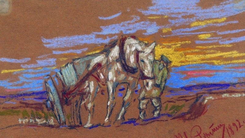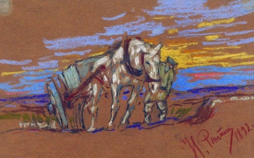 Графика Репина представлена тремя рисунками пастелью и карандашом и двумя офортными листами. Набросок Репина «Везущая лошадь» выполнен пастелью, всего несколькими цветами. В этом листе небольшого размера чувствуется усталая мощь крестьянской лошади, тянущей повозку на фоне поля и закатного неба. По отношению к лошади небольшой кажется фигурка хозяина-крестьянина, сочувственно поглядывающего на свою помощницу. Этот рисунок пастелью был преподнесён в дар музею в 1930 иркутянином М. Лейбовичем.