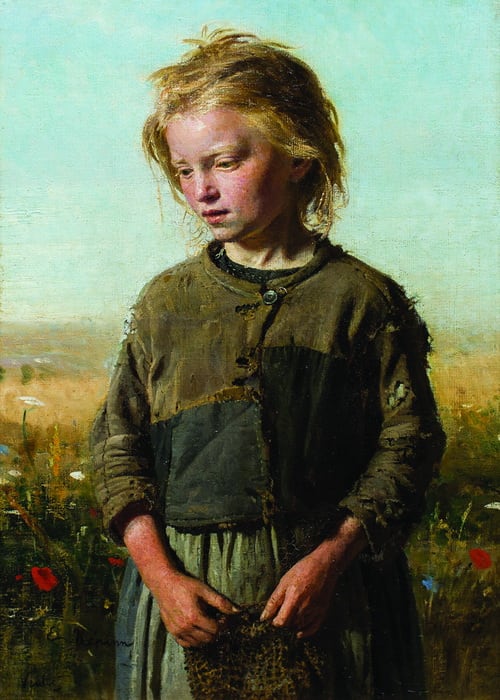Детский образ нищей девочки с растрепанными на ветру волосами, с рассыпающейся на глазах от ветхости одежонке, с сеткой для ловли рыбы в руках, на фоне пронизанного воздухом и солнечным светом пейзажа с детства знаком каждому иркутянину. Немногие знают при этом, что ставшая по-настоящему родной картина написана во Франции, во время пенсионерской (от фр. Pеnsion – обеспечение) поездки Ильи Репина от Императорской Академии художеств. Девочка, изображенная на картине француженка, а пейзаж, окружающий её, художник увидел в Нормандии близ местечка Вёль. Репин был совершенно очарован природой в окрестностях Вёля: «Не могу удержаться от восторга! Так хорош Вёль. Места во всяком роде восхитительные! В первое же утро я окунулся в поле: земля была влажная от мелкого дождика; колосья высокой пшеницы и риса скрывали от меня горизонт; только по темно-синему, сероватому небу неслись белые хлопья облаков, а узкая дорожка вся украшена полевыми цветами и маком – прелесть, прелесть! И какой восхитительный воздух; дышится чисто, легко… Пейзажи на каждом шагу, и разнообразие необыкновенное во всяком роде есть…», – так он писал своему другу и товарищу по кисти Василию Дмитриевичу Поленову в 1874 году. Было и другое письмо Поленову, в котором Репин ругал маленькую натурщицу, так как «девчонка плохо стоит». Портрет нищей девочки был написан на пленэре в один сеанс. Позже его приобрел Сукачёв. В 1936 году Иркутский художественный музей выпустил каталог собрания, где была указана и «Нищая» Репина. Так о картине узнали в столице, заинтересовались ею. Первая реставрация произведения была осуществлена еще в 1943 году. Несмотря на трудности военного времени, город вызвал из Москвы реставратора П. Полежаева, который «натянул холст, промыл от загрязнения, затонировал угол сверху, покрыл лаком». В 1947 году «Нищая» отправляется в Москву, где её ожидала ещё одна реставрация и фотосъёмка. Действительно мировую известность картина обрела в 1948 году, когда вышел в свет монументальный труд «И.Е. Репин. Художественное наследие» под редакцией И. Грабаря и И. Зильберштейна, там полноцветная репродукция «Нищей» была включена в серию этюдов художника, написанных в Вёле. С этих пор картина включалась во все монографии о Репине, часто репродуцировалась.