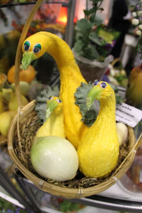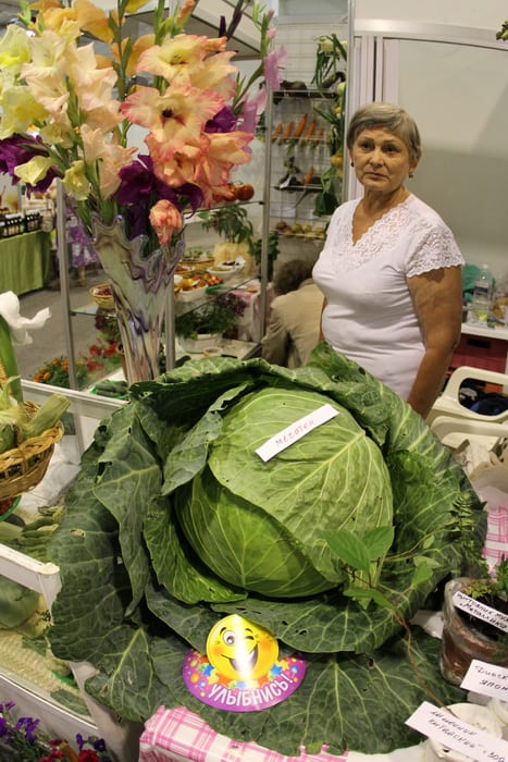 Заметила такой факт: на выставках год от года всё больше появляется не только крупноплодных фруктов, но и овощей. Если раньше помидоры по 700–800 и более граммов весом были единичными, то нынче они присутствуют практически в каждой экспозиции. Вы бы видели с каким неописуемо азартным видом демонстрировала свой помидор сорта Алсу член иркутского клуба «Садовод и огородник» Зинаида Николаевна Любимова, он оказался как бы сдвоенным и очень увесистым. А другая её одноклубница Зоя Георгиевна Усова показала нам Армянский огурец или ещё её называют огурдыня, так написано на семенном пакетике. Вырос этот овощ полукруглым и большим. Чем-то напоминает легинарию, но это не она. Говорят, что в молодом возрасте солится и маринуется и имеет сладковато дынный аромат и привкус.