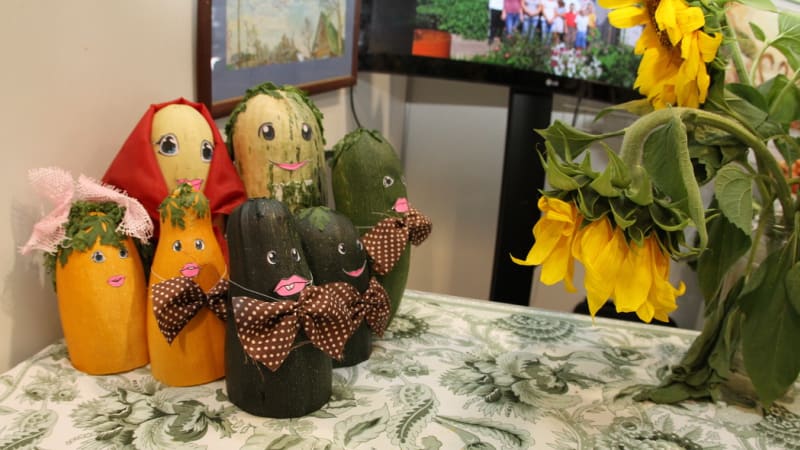 Члены садоводства «Октябрьское» также широко продемонстрировали свои необыкновенно разнообразные и богатые урожаи. Немало и дизайнерских задумок. Где-то здесь в тени у пруда на брёвнышко присели отдохнуть после баньки дед да бабка. А рядом радует урожаем овощей и фруктов небольшое деревце «Мечта садовода» в исполнении Ульяны Каньшиной.