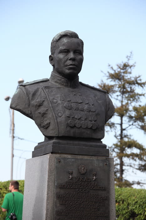 В Иркутске в память о полководце установлен бюст в районе Вечного огня. «Этот памятник менял место – раньше, например, стоял на площади у цирка,  но в итоге оказался здесь, над великой сибирской рекой, – продолжает рассказчик. – Это место он заслужил». Несмотря на то что в этом году 70-летнего юбилея Победы иркутский мемориал Вечного огня не был реконструирован, его нужно обновить, настаивает историк: