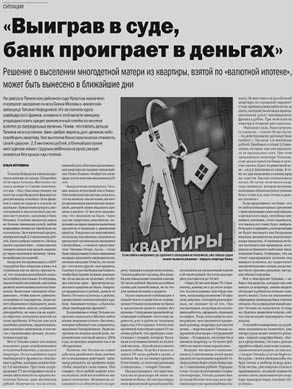 Иркутяне на минувшей неделе начали собирать деньги, чтобы выкупить квартиру для многодетной мамы. О ситуации Татьяны Нефедьевой наша газета писала трижды (номера от 2 июня, 11 и 25 августа нынешнего года. – Ред.). Вкратце напомним: Банк Москвы через суд добился возврата квартиры, которую Татьяна взяла по ипотеке. Женщина стала первой валютной заёмщицей, «приговорённой» к выселению. Во время судебного процесса сотрудники банка неоднократно говорили о том, что не заинтересованы в шумихе и рассматривают возможности реструктуризации кредита (из-за резкого падения рубля по отношению к валюте кредита швейцарскому франку ежемесячный взнос за кредит вырос в 3-4 раза). Татьяна, которая 7,5 года добросовестно платила взносы, заявляла, что и дальше готова отдавать разумные суммы. Но приемлемые условия для того, чтобы женщина с детьми осталась в квартире, предложены не были.