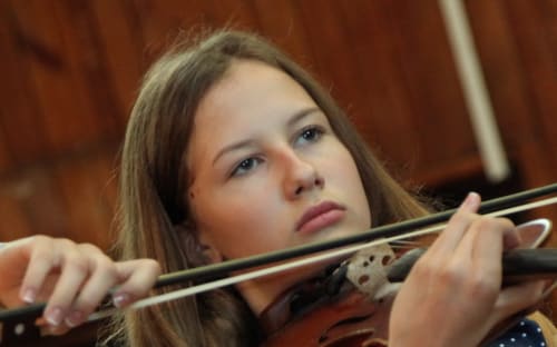 А вот 14-летняя ангарчанка Полина Титова играет на собственной скрипке. От хорошего инструмента очень многое зависит, поэтому родители сделали всё, чтобы у девочки была своя скрипка. Родители Полины связаны с искусством, папа музыкант, мама художник, их не нужно было убеждать в важности этого приобретения. В музыку Полину привели ещё в три года.