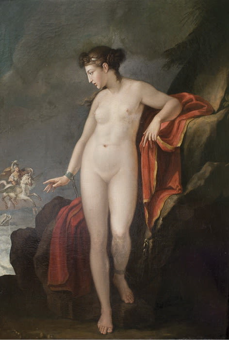 О картине «Прикованная Андромеда» сведения не найдены. Однако есть обстоятельство, которое наводит на размышления. Разглядывая картину, ловишь себя на мысли, что вначале на ней, по всей вероятности, была одна главная героиня, а игрушечный Персей на крылатом Пегасе вписан несколько поспешной кистью в силу каких-то чрезвычайных обстоятельств. Но каких? Скорее всего, это останется загадкой. Однако есть соблазн выдвинуть одну из версий, основанную на подписи художника. Для этого вернёмся к дате на картине: 1807 год. Чем же он знаменателен для России и не только? В Петербурге и Москве уже восьмой год заняты тревожными разговорами о триумфальном шествии по Европе армии Наполеона (Россия вместе с другими странами с 1798 года находилась в состоянии войны с Францией). Обсуждали альпийский поход Суворова в 1799 году, выход России из антифранцузской коалиции в 1800-м, Амьенский мирный договор 1802-го; возобновление войны в 1803-м, Трафальгарское сражение 1805 года, созданную в этом же году 3-ю  коалицию, куда вновь вошла Россия. Наконец, победоносную кампанию Наполеона в 1805 – 1807 годах, закончившуюся выгодным для него Тильзитским миром. И неизменно возвращались к сражению 26 января 1807 года, когда Наполеон пытался уничтожить русское войско при Прейсиш-Эйлау (с 1946 года Багратионовск Калининградской области). Это была самая кровавая битва в период наполеоновских войн. Здесь русская армия нанесла первый крупный удар и остановила непобедимую армию Наполеона. После него противником Франции оставалась только она. И хотя в этой битве не было победителей, Петербург воспринял её как истинную победу: «По улицам с музыкой во­зили отбитые французские знамена, а Бенигсен, командовавший русскими войсками, был пожалован андреевской лентой».