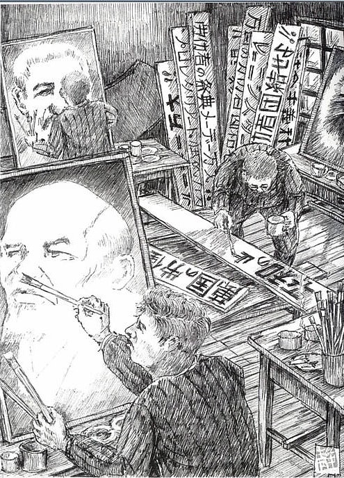 и портреты для Первомая, – вспоминал Ямасита Сидзуо. – Трое художников, включая меня как временный состав, работали в беспорядке ателье лагеря»