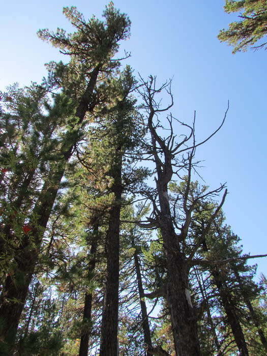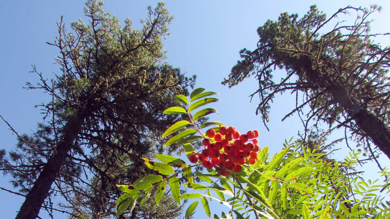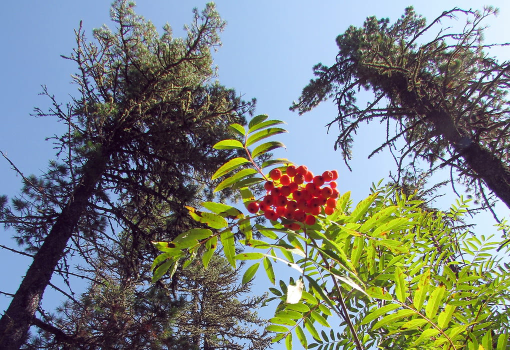 Вокруг нас хоть и не очень густая, но довольно пышная зелень листвы, сквозь которую благородными седовато-серыми колоннами просматриваются стволы кедров. Под ногами глубокий пружинящий мох, поросший черничником и брусничником одновременно. Ягод немного – урожай нынче так себе, но пару-другую горсточек из-под заросшей мхом толстой валёжины в рот отправить – это легко. И, если не поднимать взгляд вверх, вокруг красота. Вкупе с тёплым солнышком даже идиллия. Вот только в самом верхнем ярусе, куда рябина оранжевыми гроздьями ягод не дотягивается, на фоне яркой голубизны теперь уже бездымного осеннего неба раскорячились сухими сучьями кедры. Кое-где видны не то чтобы уж совсем зелёные, но зеленоватые, сильно ажурные кроны взрослых деревьев.