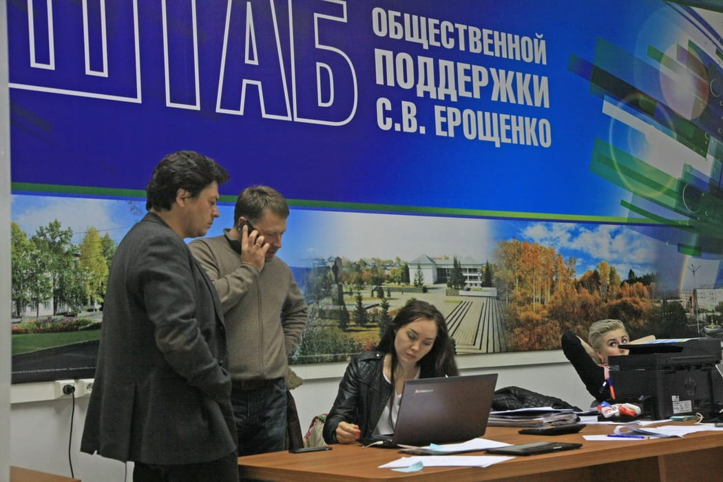В «единороссовском» штабе поддержки Сергея Ерощенко журналистов приняли радушно. И даже дали первые данные экзит-полла, как собственного, так и агентства «Наша Сибирь». На 20 часов 27 сентября, по данным «Нашей Сибири», кандидат Сергей Ерощенко побеждал Сергея Левченко в Ангарске, Братске, Усолье-Сибирском, Черемхове, Саянске, Свирске, Нижнеудинском, Черемховских районах и других территориях. Тогда же секретарь ИРО «ЕР» Сергей Брилка дал комментарий, что по данным партийных опросов лидировал также Сергей Ерощенко. К слову сказать, версии, что ещё не всё проиграно, лидер региональной «ЕР» будет придерживаться вплоть до полуночи.