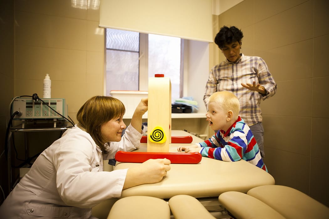 Следующие десять минут уходят на то, что физический терапевт, педиатр, невролог и реабилитолог договариваются: гимнастика действительно противопоказана, но накачать мышцы спины ребёнку можно было бы и в бассейне при помощи системы упражнений, которая вот прямо здесь и разрабатывается.