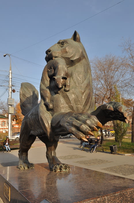 «Изловившего соболя барса», который с течением времени претерпел несколько метаморфоз, Иркутск, к слову, позаимствовал у Якутска. Ещё в первой половине XVII века тот красовался на печати Якутского острога и, чуть позднее, на гербе северного города, но «переехал» южнее вслед за местом размещения сибирских воевод. Но соболя на символе столицы Республики Саха давно держит орёл, а Иркутск прочно ассоциируется со зверем с нетипичными для семейства кошачьих перепончатыми задними лапами и широким хвостом. Нет ничего удивительного в том, что он, изваянный в металле, ранней осенью 2012 года появился на входе в новый городской символ – 130-й квартал. Но и на эту площадку он «сбежал» с места, изначально выбранного авторами идеи для его размещения – перекрёстка улиц Чкалова и Степана Разина напротив выезда с Глазковского моста, на котором по-прежнему громоздится круглая бетонная конструкция с надписью «Кировский район». Но монументальный зверь, изначально символизировавший богатый пушниной край Российской империи, за несколько лет прекрасно вписался в другой участок городского пространства.