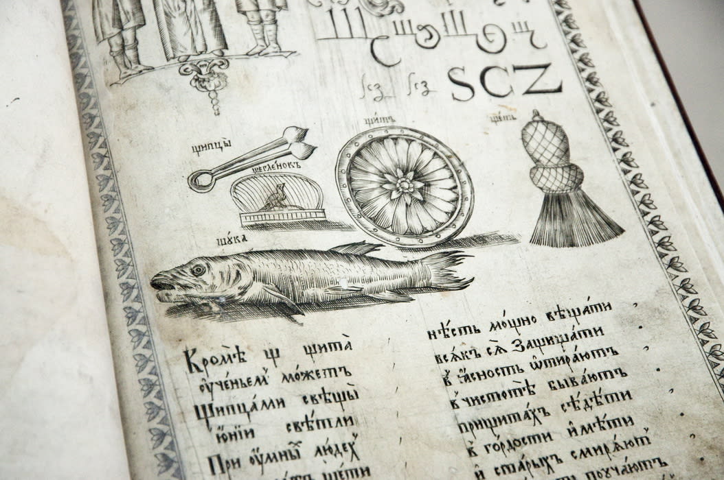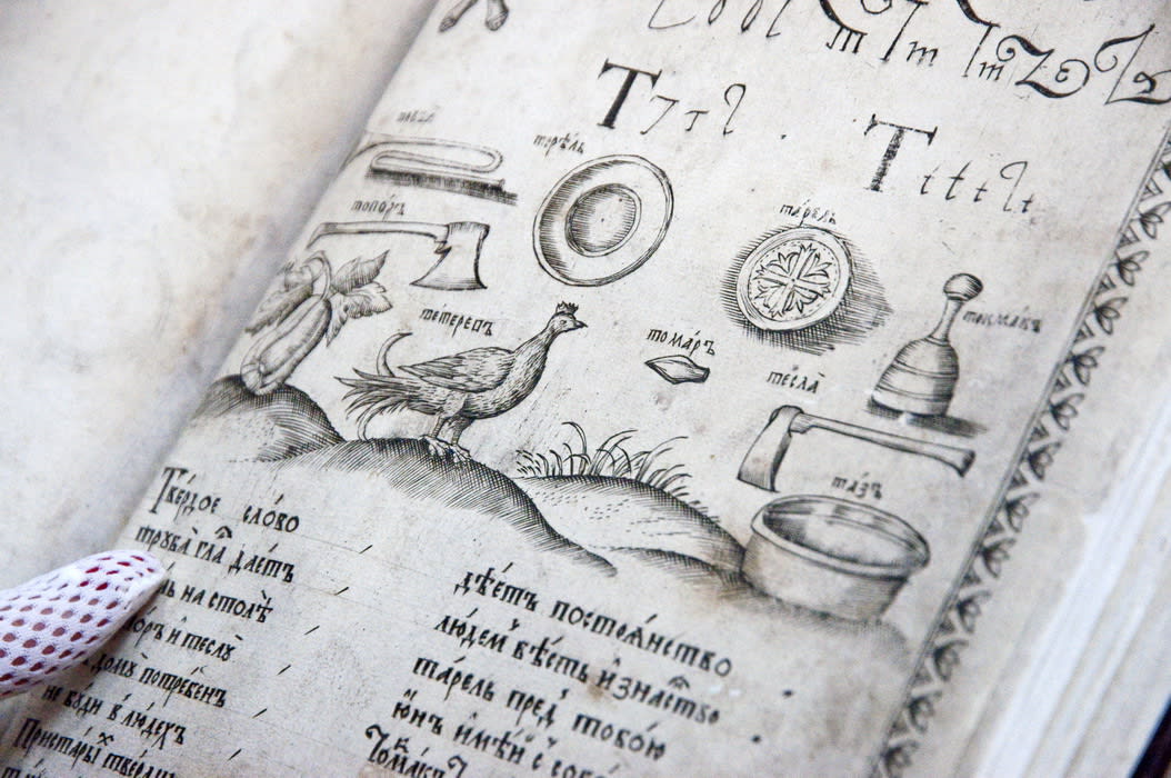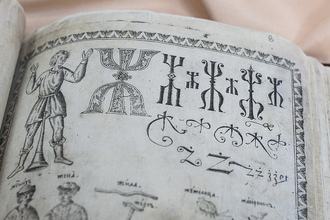 Светлана Корбут позволила полистать «Букварь», надев специальные перчатки. К редким книгам нельзя прикасаться без них. Каждую букву здесь представляют человеческие фигуры в различных позах и костюмах. Далее идут изображения печатных, строчных букв и скорописных знаков. «Целая строка посвящена греческим и латинским буквам с их названиями, то есть сделана попытка одновременного постижения алфавита славянского, греческого и латинского», – говорит Светлана Корбут.