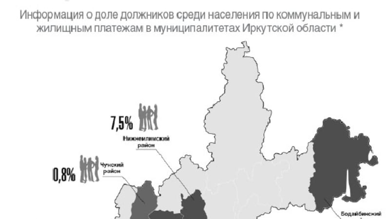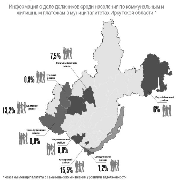 Сумма задолженности в населённом пункте не связана с уровнем жизни населения, его платёжеспособностью. Напротив, чем крупнее город, тем больше (в процентном соотношении) в нём недобросовестных собственников жилья. Если составлять карту долга, она будет выглядеть следующим образом: менее дисциплинированные потребители проживают в центральных и южных районах. По данным судебных приставов Приангарья, тревожная ситуация на протяжении долгого времени сохраняется в Ангарском районе. Здесь 15,5% населения не платят за ЖКХ. На втором месте Братский район (13,2%), на третьем – Падунский район Братска (11,3%). В Черемховском районе 8,8% потребителей не оплачивают коммуналку, в Усольском – 6,5%.