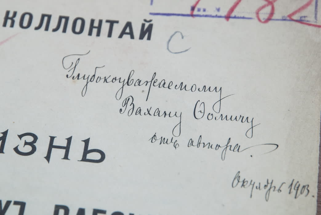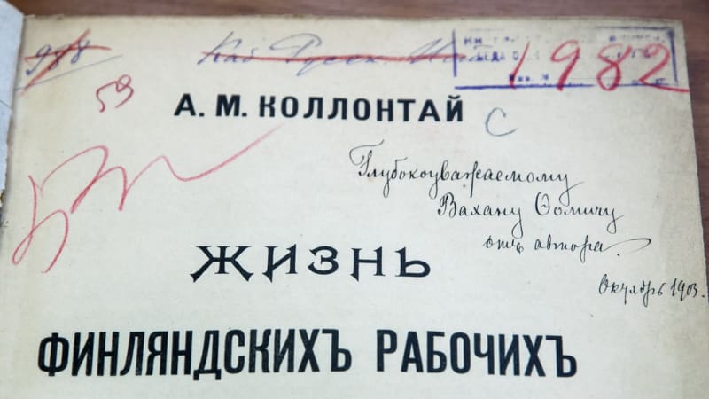 «Глубокоуважаемому Вахану Фомичу от автора. Октябрь 1903» – эта надпись на книге «Жизнь финляндских рабочих» принадлежит Александре Коллонтай, первой в мире женщине-послу. Книга хранится в секторе редких книг и рукописей библиотеки педагогического института Иркутского госуниверситета. В 2013 году библиотека пригласила в редкий фонд специалиста – книговеда Ирину Бедулину, целью её работы стало раскрытие фонда и его популяризация, ведение просветительской деятельности. При работе над формированием коллекций редкого фонда и была обнаружена книга с автографом Александры Коллонтай. Но кто такой Вахан Фомич? Несколько месяцев поисков дали положительный результат – инскрипт Александры Коллонтай адресован Вахану Фомичу Тотомианцу, известному российскому и зарубежному экономисту. По всем признакам находка является книжным памятником федерального значения.