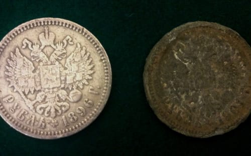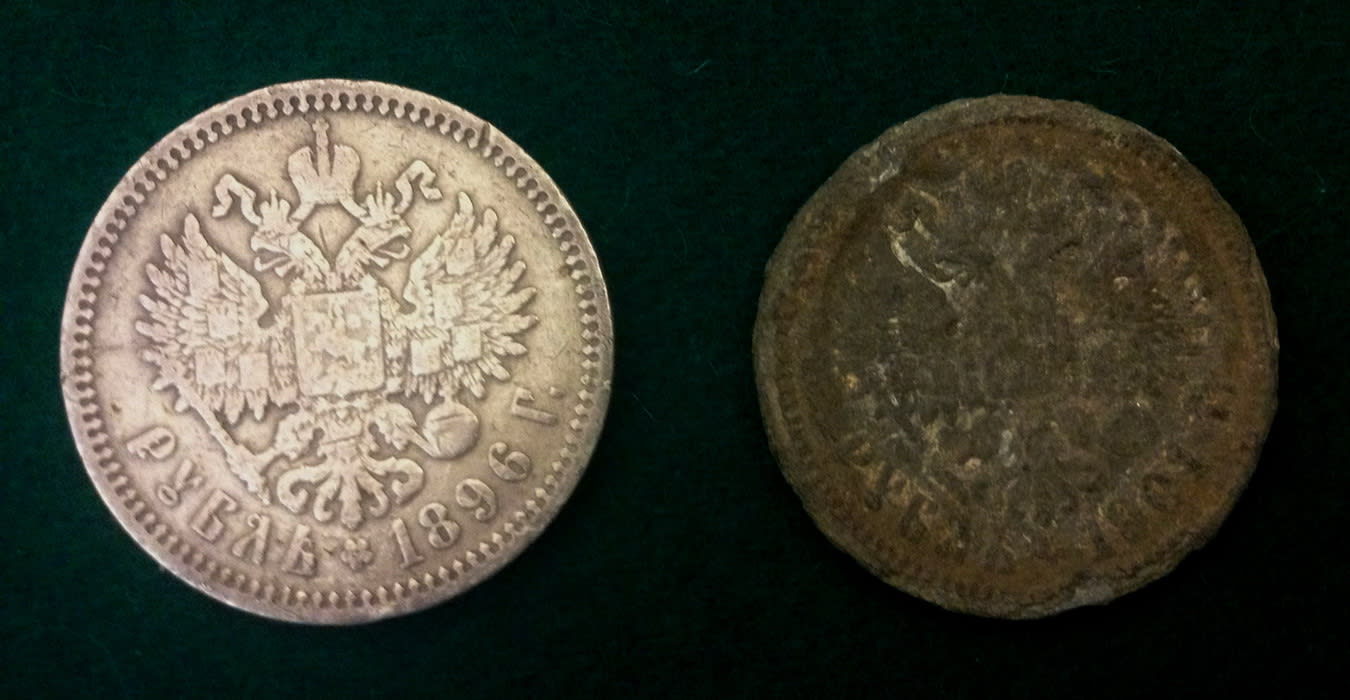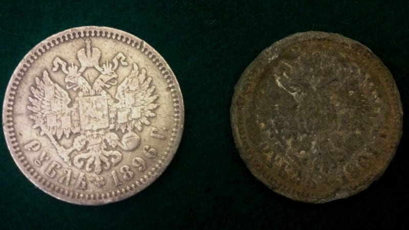 В кладе находилось четырнадцать монет достоинством 1 рубль и 50 копеек и слиток из сплава металлов, предположительно сурьмы, цинка и свинца. Датировка монет – 1896, 1899 и 1901 годы. Сохранность монет удовлетворительная, на некоторых из них видно посеребрение. Эти предметы из клада фальшивомонетчиков и представлены сегодня на выставке в Музее истории города.