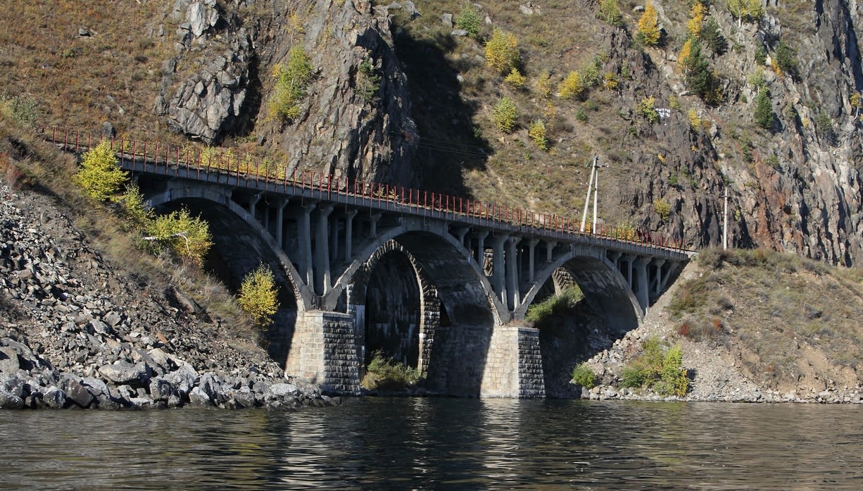 Говоря о Кругобайкалке, невозможно не рассказать о мосте над бухтой Берёзовой. Здесь, на сотом километре трассы, высится скалистый мыс, под ним расположилась небольшая бухта, окружённая крутыми скалами. Для прокладки пути нужно было либо сделать 500-метровый туннель, либо соорудить мост, но не через реку, а над этой самой бухтой. Трудность была в том, что её глубина в 28 метров не позволяла поставить промежуточные опоры. При этом ширина бухты более 100 метров. Основная несущая конструкция моста в итоге составила почти 116 метров длиной и 19 метров высотой.
