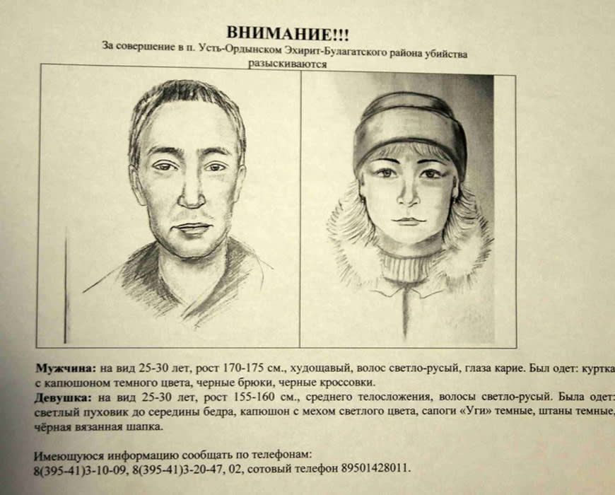 Подозреваемых пока нет, но за две недели сменилось несколько фотороботов. Первый, человека нейтрально-славянской внешности, был составлен сотрудниками оперативной группы местной полиции со слов продавщицы одного из местных магазинов. Как стало известно «Иркутскому репортёру», приблизительно во время совершения преступления – около пяти часов вечера – в один из магазинов Усть-Ордынского, в районе неподалёку от Северного, вошёл молодой мужчина. Он привлёк внимание продавщицы тем, что прятал правую руку в карман, а когда ненадолго её достал, собираясь рассчитываться, она увидела, что рука окровавлена с тыльной стороны. Он купил бутылку водки. Как впоследствии она пояснила сотрудникам полиции, мужчина этот был ей не знаком, но она вспомнила, что он заходил в этот магазин месяца три-четыре назад.