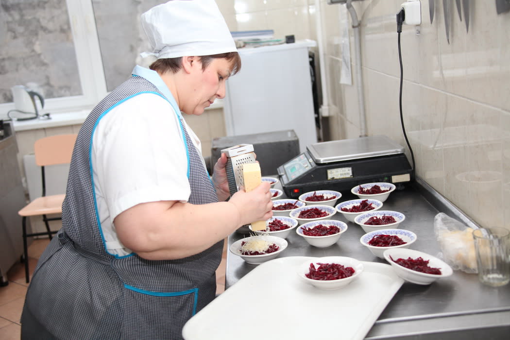 И если раньше здесь был лишь обеденный зал, при нём же кухня и мойка, то после ремонта школьная столовая разбогатела на несколько цехов. В горячем цехе готовят, в кондитерском пекут, в мясорыбном производят сырую разделку, в холодном делают салаты. В овощном цехе овощи чистят и хранят отдельно. Есть также цех сыпучих продуктов и цех обработки куриного яйца (оно проходит три стадии обработки, включая дезинфекцию в специальном растворе, что защищает от сальмонеллёза). Кухонную и столовую посуду моют отдельно.