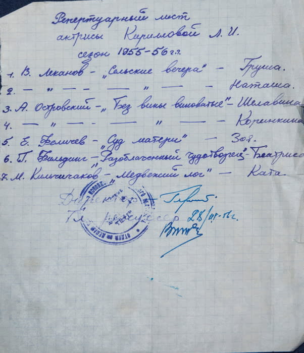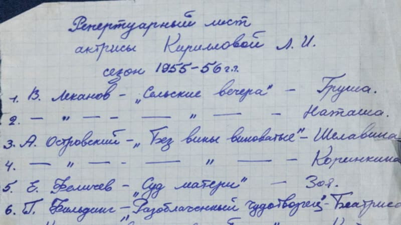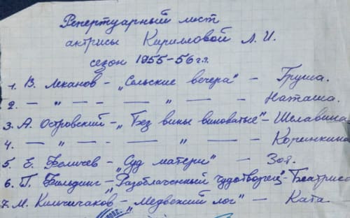Самое интересное, что часть оставшихся от Любови Иосифовны программок – с автографами режиссёров, директора театра. «Уважаемой Любови Иосифовне, поздравляем с новым спектаклем. Директор театра 7 февраля 1953 года». Вероятно, речь идёт о спектакле «Егор Булычев и другие», где Кириллова играла горничную Глафиру. В прессе спектакль был раскритикован, и вот тут появляется в «Восточке» фамилия Кирилловой: «Однако горничная Глафира (артистка Л.И. Кириллова), интеллигент Тятин (артист И.Н. Конопацкий), старый Донат (артист Г.Г. Щербаков)… ещё не имеют в спектакле чёткого, яркого воплощения». Можно представить, каково это было читать Любови Иосифовне.