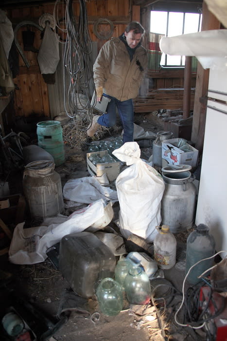 Без хозяина двор весь завален кучами навоза, но видно, что строения делали не торопясь и с душой – в глубине двора стоят две стайки, слева – избушка и баня. Впрочем, быстро выясняется, что в большом доме Игорь Ковалёв не живёт – здание пустует. Внутри, в просторных светлых сенях, аккуратно расставлены и разложены какие-то полезные в хозяйстве вещи – от стеклянных банок до мопедов. Видно, что хозяин – рачительный и бережливый. Но вот жилые помещения – это стены без отделки, косяков и дверей. Какой-то деревянный лабиринт.