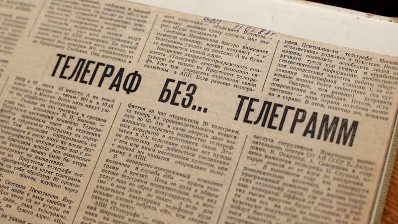 В 1985 году на Иркутском телеграфе была установлена и фототелеграфная аппаратура, которая позволяла передавать сложные тексты, рисунки. Одна из таких фототелеграмм хранится в музее. Это уже редкость, поскольку фототелеграф просуществовал короткое время и ушёл в небытие. «Министерство связи СССР. Фототелеграмма» – значится на бланке. В графе «служебные отметки» стоит: «От души». Телеграмма с рисунком, на котором изображены тюльпаны, был отправлена в мае 1990 года связистами своей коллеге. Стихи тоже написаны от руки: «Ты сегодня с друзьями и близкими вспомни путь, что вместе прошли. Невзирая на ставки низкие в телеграфе счастье нашли».
