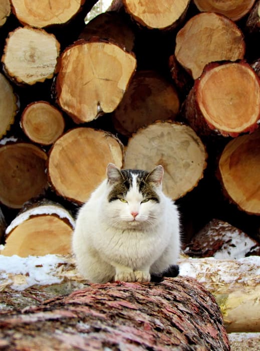 Две первых «телеги с дровами» – гружённые круглым лесом автомобильные прицепы – и остатки штабеля встретили на пустынной, без людей, площадке, как раз на границе пожарища. Спустились ещё немного и оказались в обжитом и довольно живописном (если бы не косогор, покрытый чахлыми, почти без крон и отчасти засохшими деревцами, написал бы – красивом) распадке. Несколько бытовок в рубленных балках и вагончиках уютно дымят трубами. Собачонка встречает нас громким, скорее радостным, чем сердитым лаем. Неведомо откуда материализовавшись, трётся о ноги здоровенный и ласковый кот. Убедившись, что на него обратили внимание, галопом мчится, задрав хвост трубой, к ещё не вывезенным штабелям брёвен и удобно устраивается там.