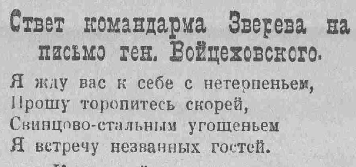 За день до расстрела в Иркутске Колчака в «Красной Армии» было напечатано стихотворение под названием «Переговоры». Это стихотворный обмен письмами генерала Войцеховского и командарма Зверева. Переговоры между ними действительно были, они даже печатались в той же газете ранее. Однако вдруг возникают стихи. Поскольку стихотворение никем не подписано (а поэты обычно аккуратно подписывались – псевдонимом или настоящим именем), вероятно, мы имеем дело с творчеством самого Зверева. Вот строчки из этого любопытного стихотворения: «Письмо ген. Войцеховского командарму Звереву: «Как в бурю свинцовая туча, к Иркутску я быстро спешу. Стихийным ударом могучим рабочих ряды сокрушу… Ворвутся в Иркутск легионы и город сравняют с землёй, расстрелы, нагайки и стоны идут неразлучно со мной…». В своём письме Зверев отвечает: «Я жду вас к себе с нетерпеньем, прошу, торопитесь скорей, свинцово-стальным угощеньем я встречу незваных гостей… В Иркутске народная сила на тризну давно уж вас ждёт. Готова сырая могила, и строят для вас эшафот. Спешите ж, усатые паны, в Иркутск в гости к нам поскорей, вас встретят у нас аэропланы и грохот, и гул батарей». Как известно, после расстрела Колчака Войцеховский, начавший было штурм, не стал брать Иркутск. Зверев ликует, ликуют его подчинённые… Пройдёт 16 лет, Зверев поездит по стране, вернётся в Иркутск. Но придут другие герои. А партизан гражданской войны и даже немного поэт в 1936-м будет репрессирован, сослан в лагеря и умрёт на Колыме в 1941 году.
