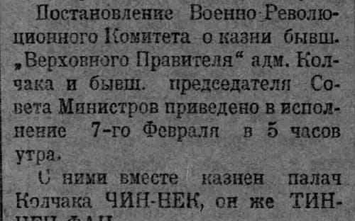 Зверев в феврале 1920 года должен был противостоять каппелевцам, которые шли на Иркутск. И тогда, в этой странной обстановке, он, похоже, тоже писал стихи. 7 февраля 1920 года в 5 утра были расстреляны Колчак и Пепеляев. Как сообщала газета «Красноармейская правда» 30-й дивизии, «6 февраля обысками в городе были обнаружены во многих местах склады оружия, бомб, пулемётных лент и проч. И таинственное передвижение по городу этих предметов боевого снаряжения, по городу разбрасываются портреты адм. Колчака и проч.». Наличие тайной организации и требование генерала Войцеховского выдать ему Колчака и его штаб и послужили причиной расстрела, поясняла газета. Интересно, что в исторических хрониках имя третьего расстрелянного практически не упоминалось. А газета сообщала вот что: «С ними вместе казнён палач Колчака Чин-Нек, он же Тин-Чен-Фан». Надо сказать, что сейчас в книгах о Колчаке приводят другое написание его имени: Чен Тинфань.