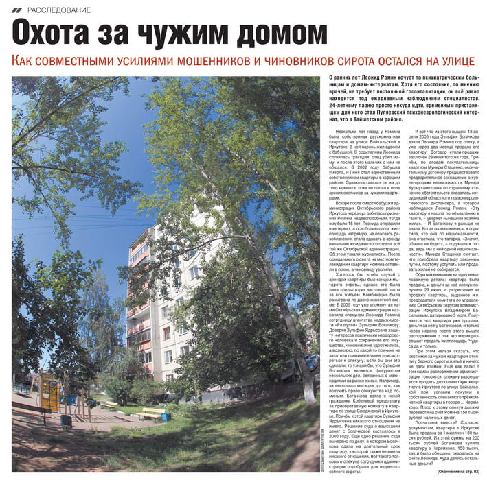 Многие наши читатели помнят Леонида Ромина, о нём мы писали не один раз. Сирота попал в руки мошенников, которые через суд признали его недееспособным, оформили опеку над ним и продали его квартиру. Благодаря помощи экс-депутата Законодательного Собрания Иркутской области Андрея Швайкина жилплощадь, хоть и не квартиру в областном центре, удалось на Ромина оформить. Но жить на своих метрах Леонид не может, поскольку не является дееспособным. Домом для него стал Пуляевский психоневрологический интернат, что в Тайшетском районе. Со своей квартиры Леонид имеет стабильный доход, его собственность сдаётся, деньги приходят на личный счёт.
