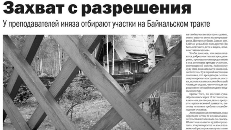 Ветераны бывшего иняза обжалуют решение областного суда о том, что их усадьбы объявлены самовольными постройками, поэтому владельцев обязали снести их за свой счёт. Решение вступило в силу первого июля прошлого года. Шестимесячный срок, определённый для исполнения, уже прошёл. И пока стороны ждут вердикта кассационной инстанции. В мае жалобы преподавателей рассмотрит президиум областного суда. Процесс происходит без шумихи и пафоса. Никто не кричит на площадях, что заслуженные люди, доктора и кандидаты наук, получили землю в награду за труд. Что для многих из них дома, которые они построили на этих участках, являются единственным жильём. Что в числе владельцев жилья есть ребёнок, которого нельзя лишить собственности без участия органов опеки. Существует реальная опасность, что так же, без лишнего шума, у педагогов и их семей отнимут ликвидные участки по правую сторону Байкальского тракта (21-й км).