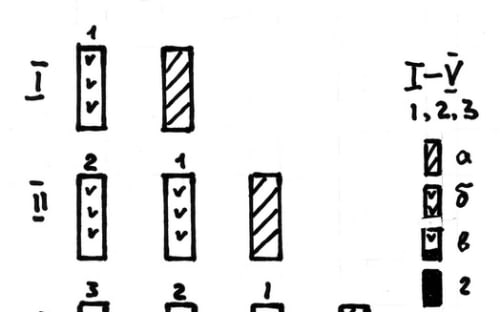 Прежде всего, важно ещё «на берегу» определиться – сколько надо иметь на участке ежегодно плодоносящих гряд. К примеру, рассмотрим вариант из трёх гряд. Тогда в общий процесс будут вовлечены пять гряд. Поэтому надо сразу резервировать для них место. И неважно, в каких уголках сада они будут располагаться, кучно или по отдельности, главное для них – быть на солнце, ориентироваться с юга на север и не подтапливаться вешними водами. Оптимальная ширина 50 см, проходы от 70 см. Схема поэтапного ввода гряд приведена на рисунке № 1.