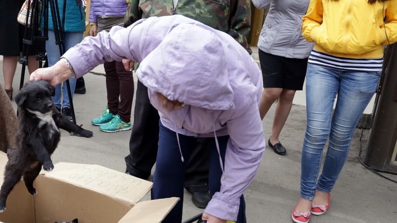 В это время первыми преодолевают испуг потребители этого вида услуг. К коробкам робко приближается женщина с ребёнком, парнишкой десяти лет, и начинает рассматривать собак.