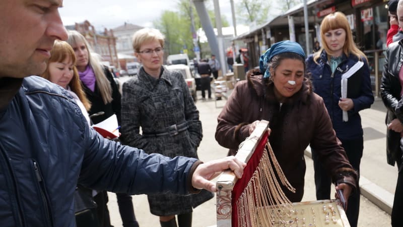 Она признаётся, что приехала в Иркутск весной из Саратовской области. Но на вопросе, откуда она берёт побрякушки для продажи, её разговорчивость резко заканчивается. Виктория Дроздова начинает ей объяснять: