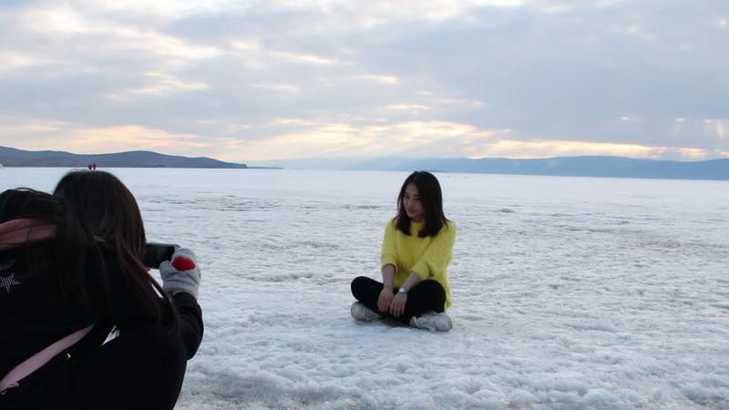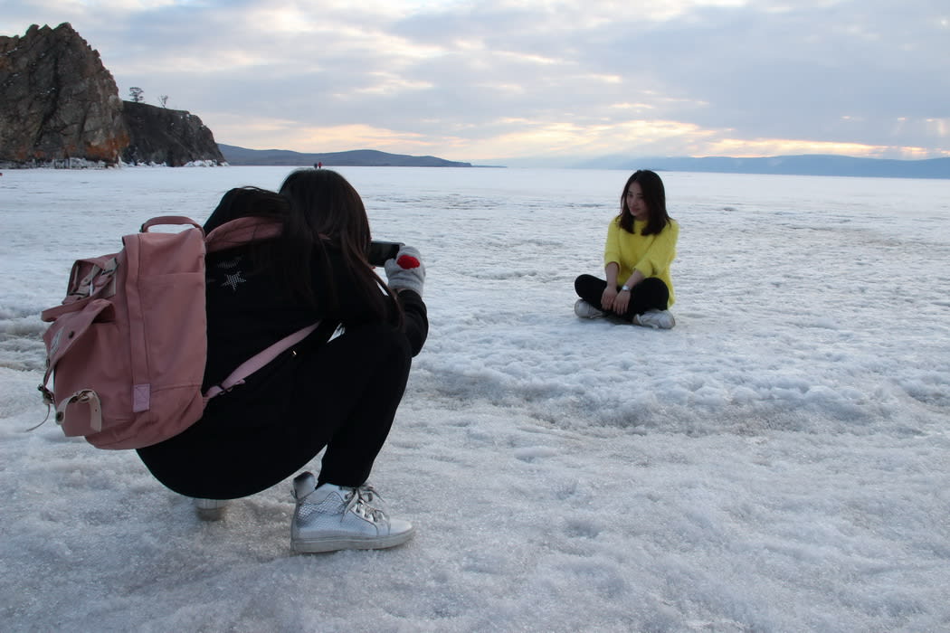 Однако выбор такого одеяния вполне оправдан, потому что и цель путешествия другая. Три китаянки по очереди позируют на камеру на фоне главной достопримечательности острова Ольхон – мыса Бурхан. Одной из них приходится для этого несколько минут сидеть на льду без верхней одежды. Простые отдыхающие в это время прогуливаются по пляжу в шапках, шарфах и тёплых куртках. Девушки-китаянки смеются, закончив фотосессию, собираются в кучку и с помощью селфи-палки делают общий кадр. «Просто мы очень любим фотографироваться», – со смехом объясняют они.