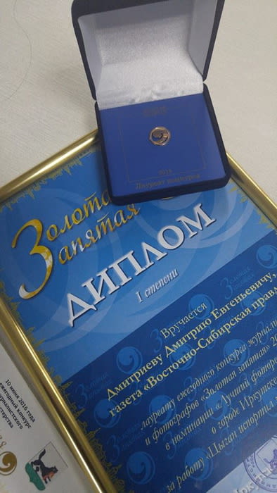 Итоги ежегодного конкурса журналистского мастерства «Золотая запятая» подвели в Иркутске в пятницу. Наш бильд-редактор Дмитрий Дмитриев победил в номинации «Лучший фоторепортаж о городе Иркутске» за работу «Цыган испортил земельный вопрос». Юлия Караваева, другой наш автор, но уже пишущий, стала обладателем звания дипломанта конкурса и заняла второе место в номинации «Лучшая публикация о городе Иркутске».