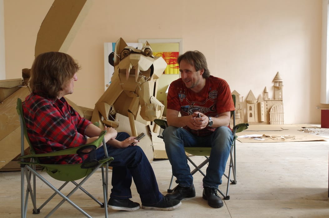 Перед тем как выйти в центр Иркутска, наш собеседник назначает встречу в мастерской в крайнем подъезде дома Кузнеца. Ориентир – баннер с рекламой фестиваля «Культурная столица». Поднявшись по наружной лестнице, под которой скрывается будка местного рыжего барбоса, попадаешь в просторное помещение, заполненное картинами, работами ломографов, картонными скульптурами… Кажется, что оказался в декорациях немного сюрреалистического артхаусного фильма. Словно режиссёр картины и его помощник, мы садимся в складные кресла и начинаем разговор. Единственный безмолвный слушатель – картонный бабр с таким же картонным соболем в зубах, стоящий за нашими спинами.