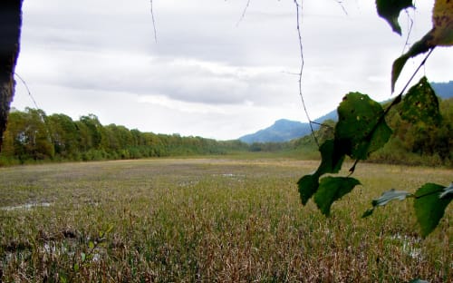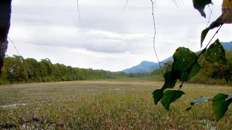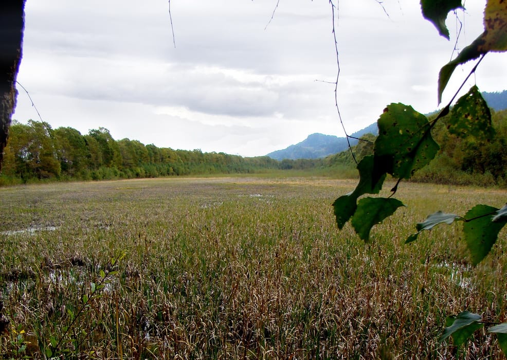 Старое, давно заполненное Байкальским ЦБК «под самый ободок» хранилище шлам-лигнина смотрится совсем не страшно. Ну, совсем как обыкновенное и в чём-то даже живописное лесное болото, обильно поросшее рогозом и другими водолюбивыми растениями. Полный штиль. Жаркое, но благодаря дымке мягкое солнце. И тишина. Слышно даже, как стрекоза крылышками чуть шелестит.