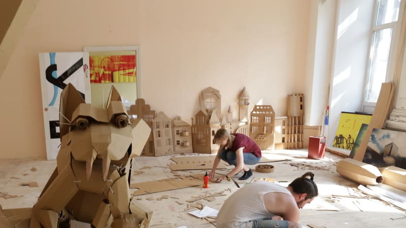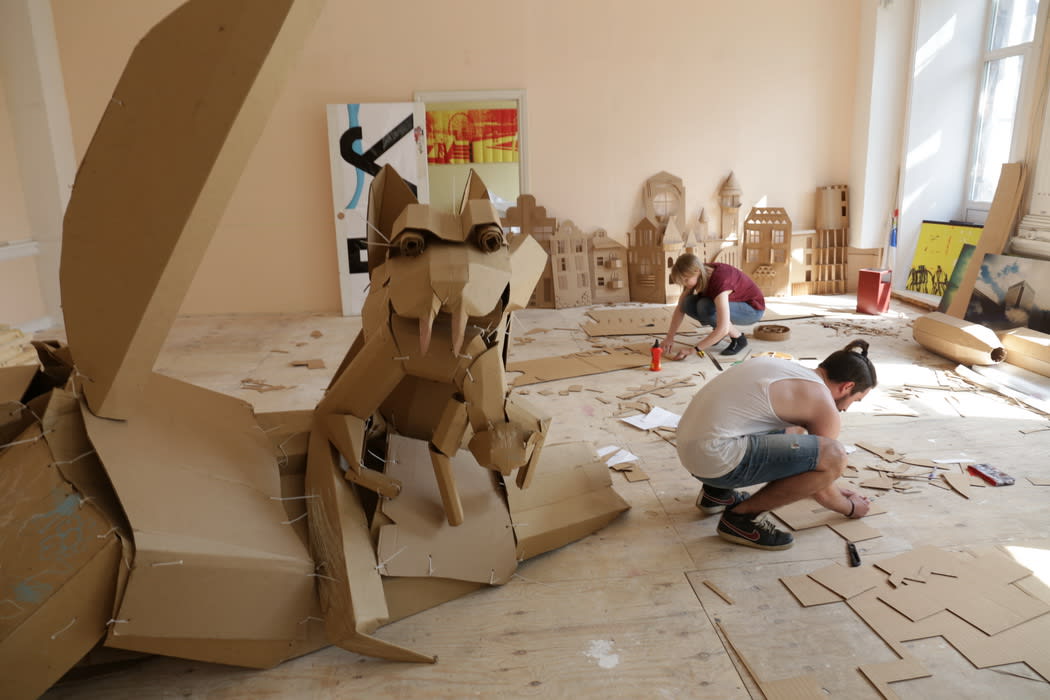 – На самом деле я сам ещё не понял, как сюда попал, – улыбаясь, пожимает плечами студент-архитектор Борис Павлов. – Про фестиваль особо ничего не знал. Предложил университетский преподаватель, стало интересно – теперь мы с однокурсницей Катей Гладковой здесь работаем с картоном. Работа началась не так давно, поэтому пока вдохновение испариться не успело.