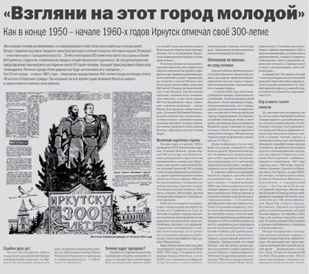 Главным торжеством, приуроченным к юбилею города, стал грандиозный «Праздник искусств», проходивший на стадионе «Труд» в течение трёх дней – 15, 16 и 17 июля. В рамках этого празднества, собравшего десятки тысяч иркутян, состоялись выступления многих видных деятелей советского искусства. Каждый из них появлялся перед публикой в открытой автомашине, делая перед выступлением так называемый «круг почёта». В празднике участвовали знаменитые киноартисты, о чём рассказывается в статье Владимира Ходия. Но нельзя не обратить внимание и на то, сколько разноплановых музыкальных номеров входило в программу торжества.